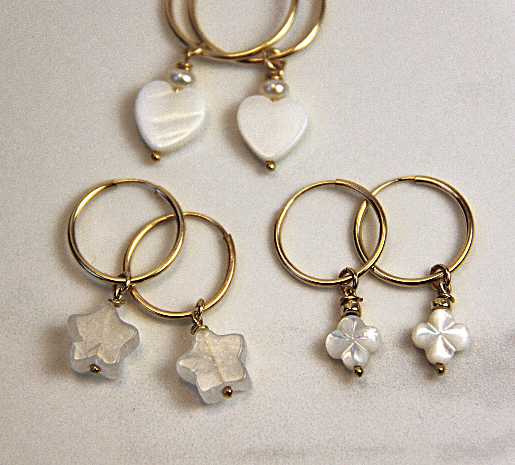 These dainty beauties feature hand-carved four-leaf clovers crafted from shimmering mother of pearl, accented with gold-filled touches for a playful sparkle.